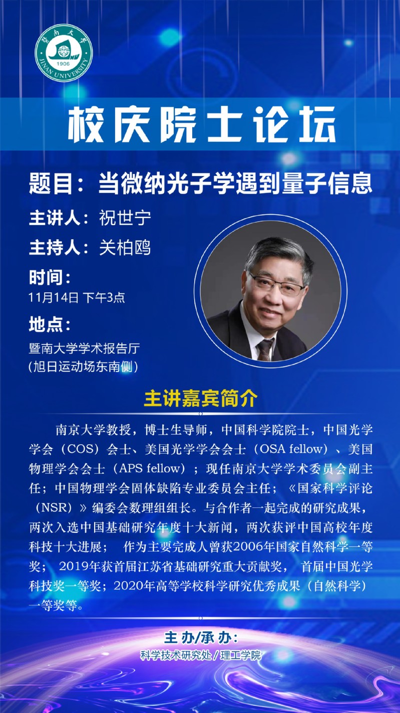 祝世寧,南京大學教授,博士生導師, 中國科學院院士,中國光學學會(COS)會士、美國光學學會會士(OSA fellow) 、 美國物理學會會士(APS fellow);現任南京大學學術委員會副主任;中國物理學會固體缺陷專業委員會主任;《國家科學評論(NSR)》編委會數理組組長。與合作者一起完成的研究成果,兩次入選中國基礎研究年度十大新聞,兩次獲評中國高校年度科技十大進展;作為主要完成人曾獲2006年國家自然科學一等獎;2019年獲首屆江蘇省基礎研究重大貢獻獎,首屆中國光學科技獎一等獎;2020年高等學校科學研究優秀成果(自然科學)一等獎等。