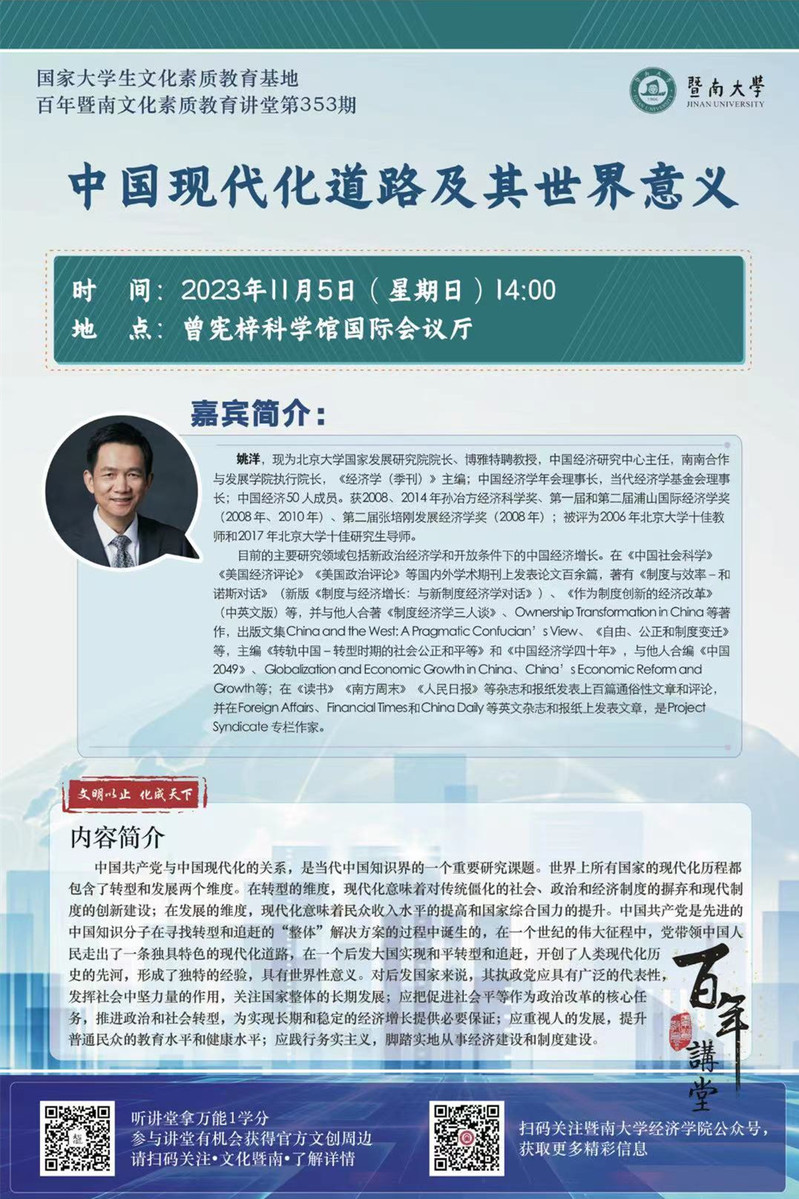 百年暨南文化素質教育講堂第353期:姚洋:中國現代化道路及其世界意義