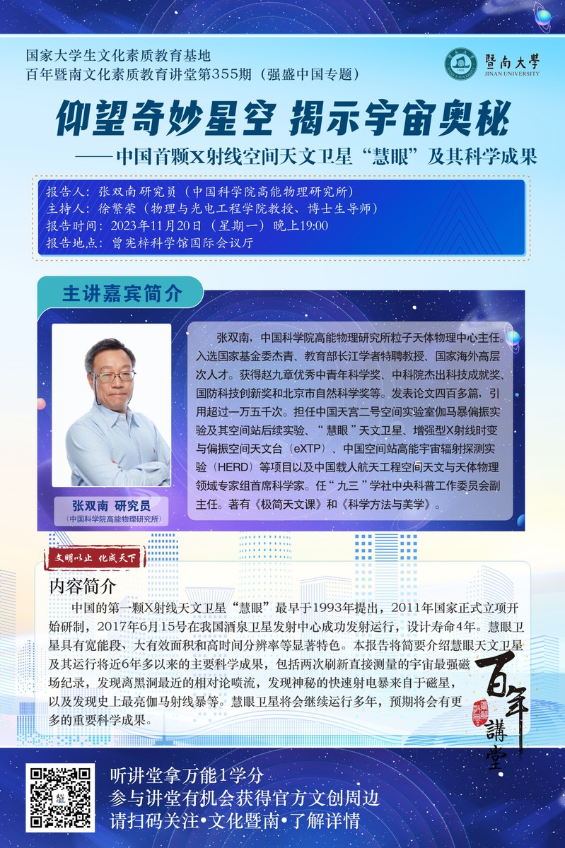 百年暨南文化素質教育講堂第355期:張雙南:仰望奇妙星空 揭示宇宙奧秘——中國首顆X射線空間天文衛星“慧眼”及其科學成果