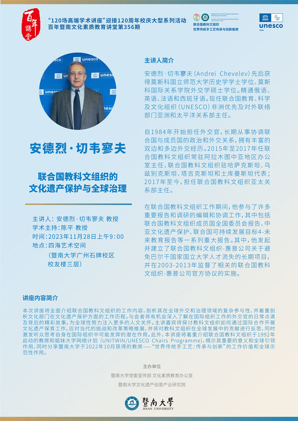 百年暨南文化素質教育講堂第356期:傾聽文化遺產的“心聲”——聯合國教科文組織的文化遺產保護與全球治理