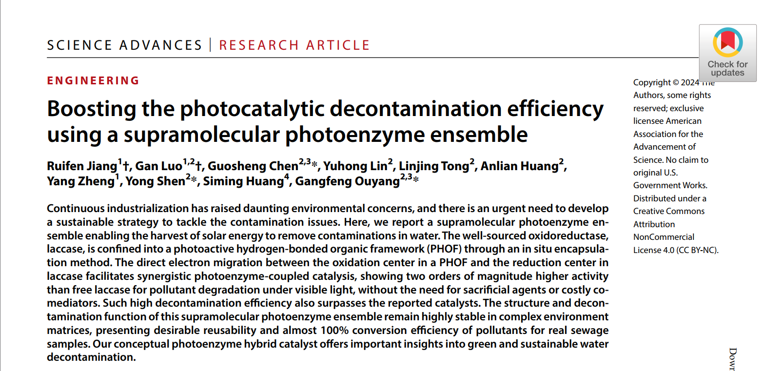 暨南大學融媒體中心訊 近日,暨南大學環境與氣候學院環境健康系(籌)江瑞芬副教授聯合中山大學陳國勝副教授、沈勇副教授以及歐陽鋼鋒教授,在Science子刊期刊Science Advances(中科院一區TOP期刊,IF=11.7)發表題為“Boosting the photocatalytic decontamination efficiency using a supramolecular photoenzyme ensemble”的最新研究成果。該研究報道了一種新型超分子光-酶催化體系,并將其應用于水體有機污染物的高效去除。環境與氣候學院碩士研究生羅贛為該論文的共同第一作者。