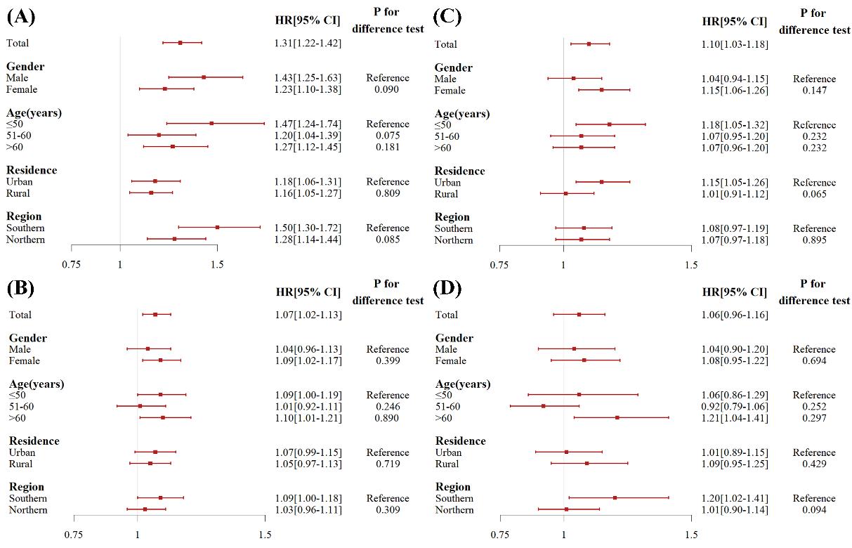 基于兩個前瞻性隊列(中國健康與養老追蹤調查CHARLS、中國家庭追蹤調查CFPS),本研究評估了O3日最大8h濃度(MDA8 O3)與循環系統疾病、心臟病、高血壓和卒中發生風險的關聯,并通過計算人群歸因分值(PAF)來評估O3暴露造成的疾病負擔。研究發現:在CHARLS隊列中,MDA8 O3暴露濃度每增加10ppb,心臟病的發病風險增加31%;在CFPS隊列中,MDA8 O3暴露濃度每增加10ppb,心腦血管系統疾病和高血壓的發病風險分別增加7%和10%。隨著O3濃度上升,男性群體和居住在中國北方地區居民發生心臟病的風險更高、城市居民發生高血壓的風險更高、生活在中國南方地區的居民發生腦卒中的風險更高(圖2)。