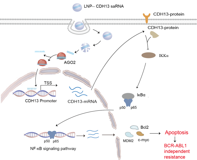 費嘉教授該研究團隊利用CDH13-saRNA靶向激活CDH13的表達,抑制CML耐藥細胞中NF-κB信號通路傳導,促進凋亡的發生,為克服CML BCR-ABL1非依賴性耐藥提供一種新的可行性方案。