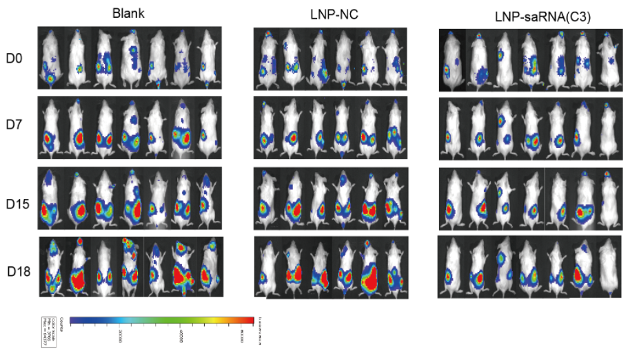 圖 2. LNP-CDH13-saRNA藥物能有效抑制K562-IMRluci細胞在小鼠體內的生長