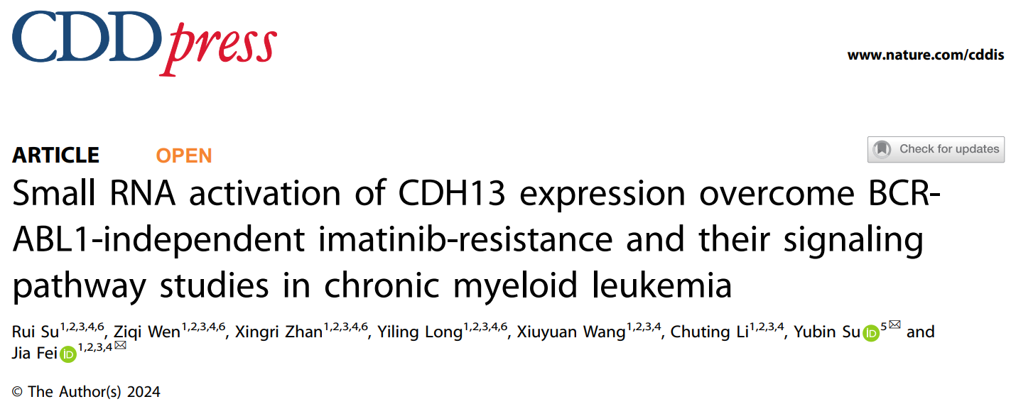 暨南大學融媒體中心訊 廣東省小核酸藥物開發工程技術研究中心主任、基礎醫學與公共衛生學院費嘉教授團隊于2024年8月23日在國際權威期刊Cell Death & Disease(中科院1區,Top期刊)在線發表題為“Small RNA activation of CDH13 expression overcome BCR-ABL1-independent imatinib-resistance and their signaling pathway studies in chronic myeloid leukemia”的研究論文。