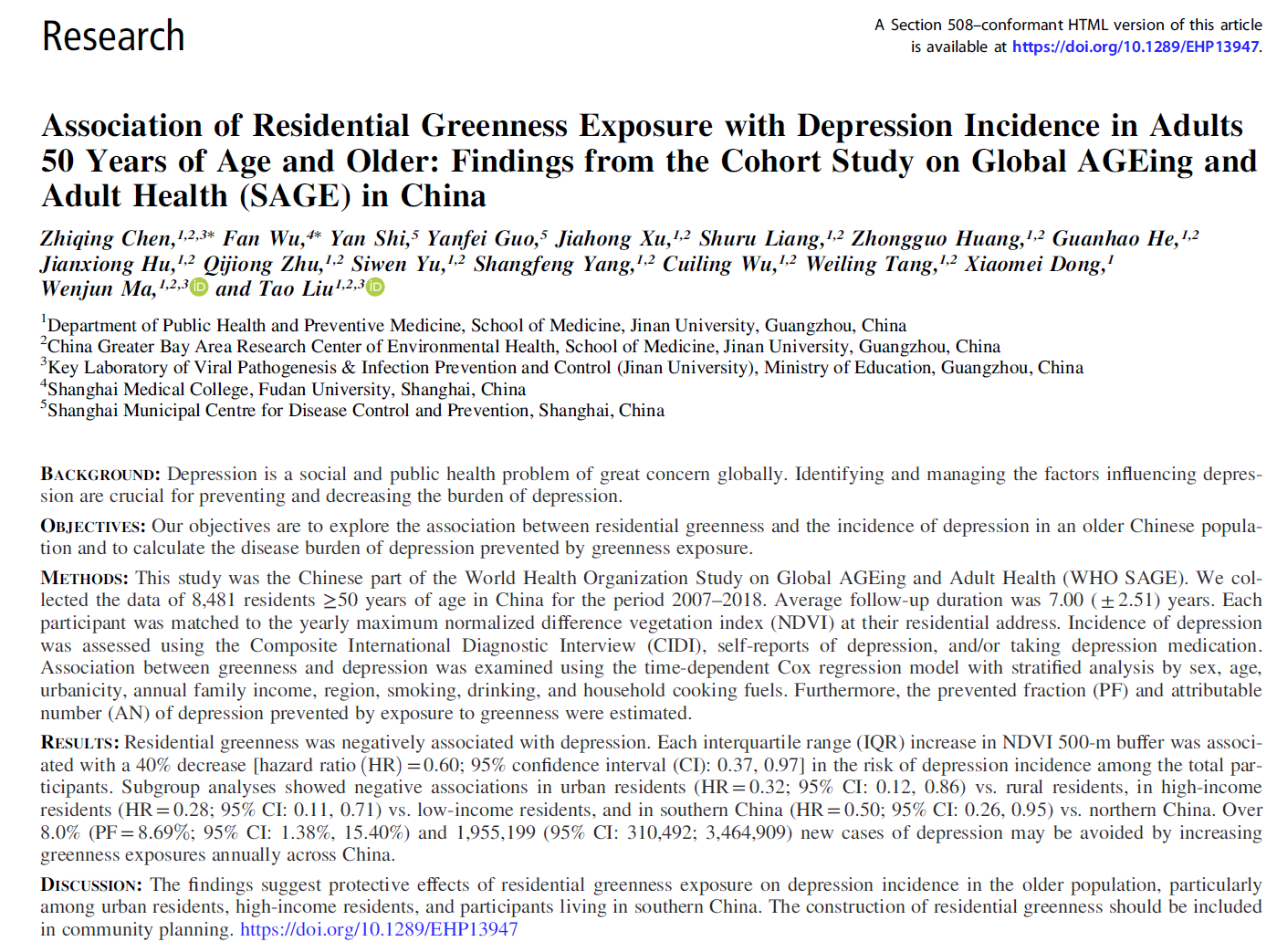 暨南大學(xué)融媒體中心訊 暨南大學(xué)基礎(chǔ)醫(yī)學(xué)與公共衛(wèi)生學(xué)院馬文軍/劉濤教授團(tuán)隊(duì)在《Environmental Health Perspectives》(IF:10.1)雜志上發(fā)表了題為“Association of Residential Greenness Exposure with Depression Incidence in Adults Aged 50 Years and Older: Findings from the Cohort Study on Global AGEing and Adult Health (SAGE) in China”的重要研究成果(圖1)。