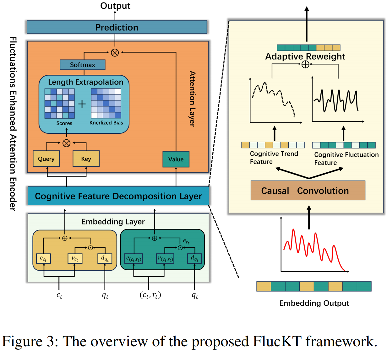 成果簡介:知識追蹤(Knowledge Tracing,KT)是一項序列預測任務,旨在利用學生的歷史學習交互數據預測其在未來問題上的表現。KT的核心在于對人類認知行為的建模,以加深對認知過程的理解。人類認知具有兩個關鍵特性:一是長期認知趨勢,反映知識隨著時間逐漸積累和穩定的過程;二是短期認知波動,源于遺忘或注意力暫時失焦等瞬時因素。現有的基于注意力機制的KT模型雖然能夠有效捕捉長期認知趨勢,但往往難以充分處理短期認知波動。這些局限性導致認知特征過于平滑,從而降低了模型性能,特別是在測試數據長度超過訓練數據長度時表現尤為明顯。為了解決這些問題,我們提出了FlucKT,一種增強短期認知波動建模的注意力網絡,用于KT任務。FlucKT從以下兩方面改進了注意力機制:首先,通過基于分解的層和因果卷積,分離并動態重權重長期與短期認知特征;其次,引入了核化偏置注意力分數懲罰,以強化對短期波動的關注,從而提升模型的長度泛化能力。我們通過在三個真實數據集上的廣泛實驗驗證了FlucKT的貢獻,實驗結果表明,該模型在長度泛化能力和預測性能上均取得了顯著提升。