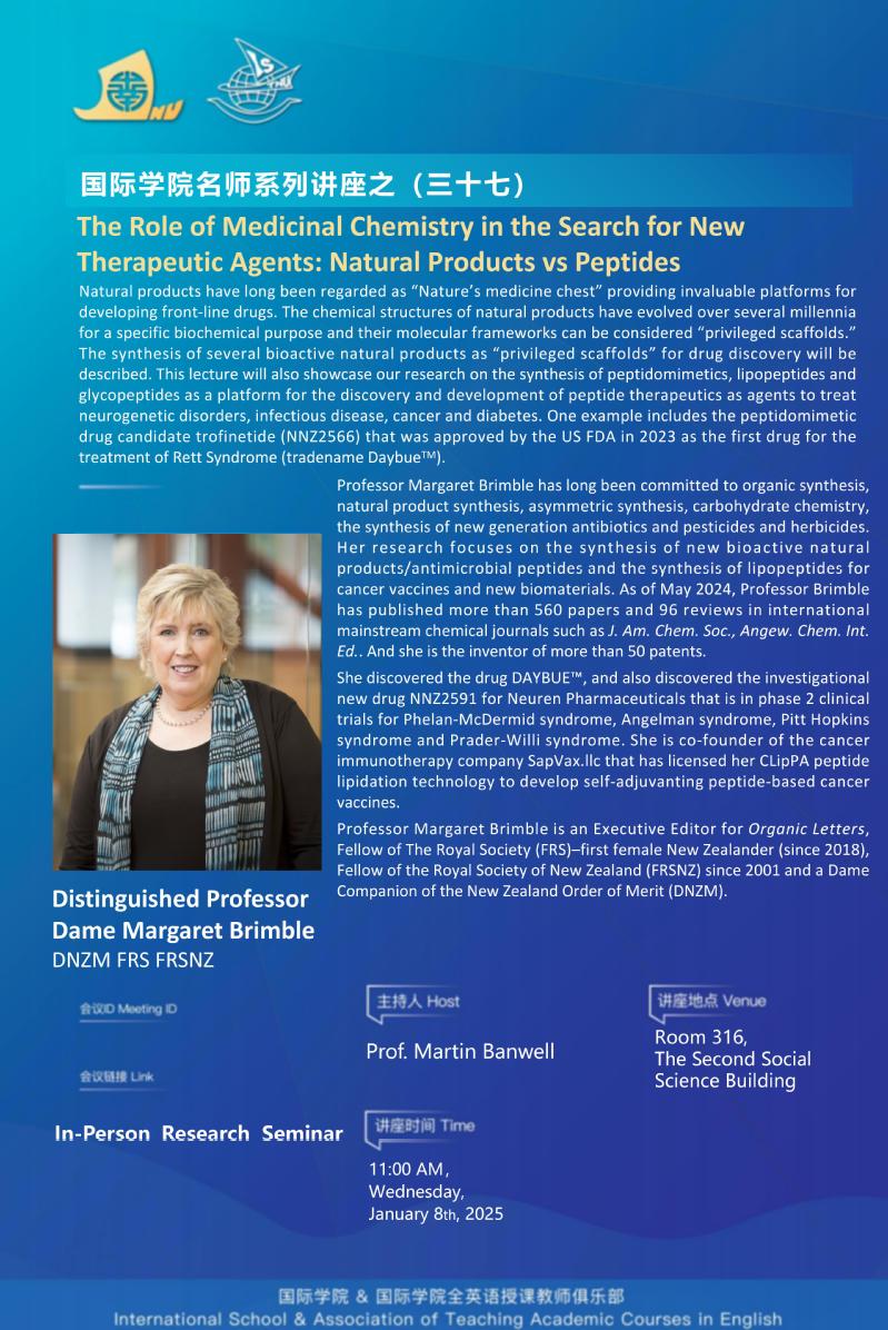 瑪格麗特·布林布爾教授是化學(xué)一區(qū)期刊Organic Letters執(zhí)行主編、2018年當(dāng)選英國(guó)皇家學(xué)會(huì)院士(新西蘭第一位獲此殊榮的女性科學(xué)家)、新西蘭皇家科學(xué)院院士(2001年當(dāng)選),新西蘭功績(jī)勛章獲得者(女爵)。瑪格麗特·布林布爾教授長(zhǎng)期致力于天然產(chǎn)物全合成、新一代抗生素和疫苗合成、碳水化合物化學(xué)研究,特別是新型生物活性天然產(chǎn)物/抗菌肽的合成及其在醫(yī)藥領(lǐng)域中的應(yīng)用。截止2024年5月,瑪格麗特·布林布爾教授在國(guó)際頂級(jí)化學(xué)期刊如J. Am. Chem. Soc., Angew. Chem. Int. Ed.等以通訊作者身份共計(jì)發(fā)表發(fā)表了560多篇論文、96篇評(píng)論,授權(quán)發(fā)明專利50余項(xiàng)。