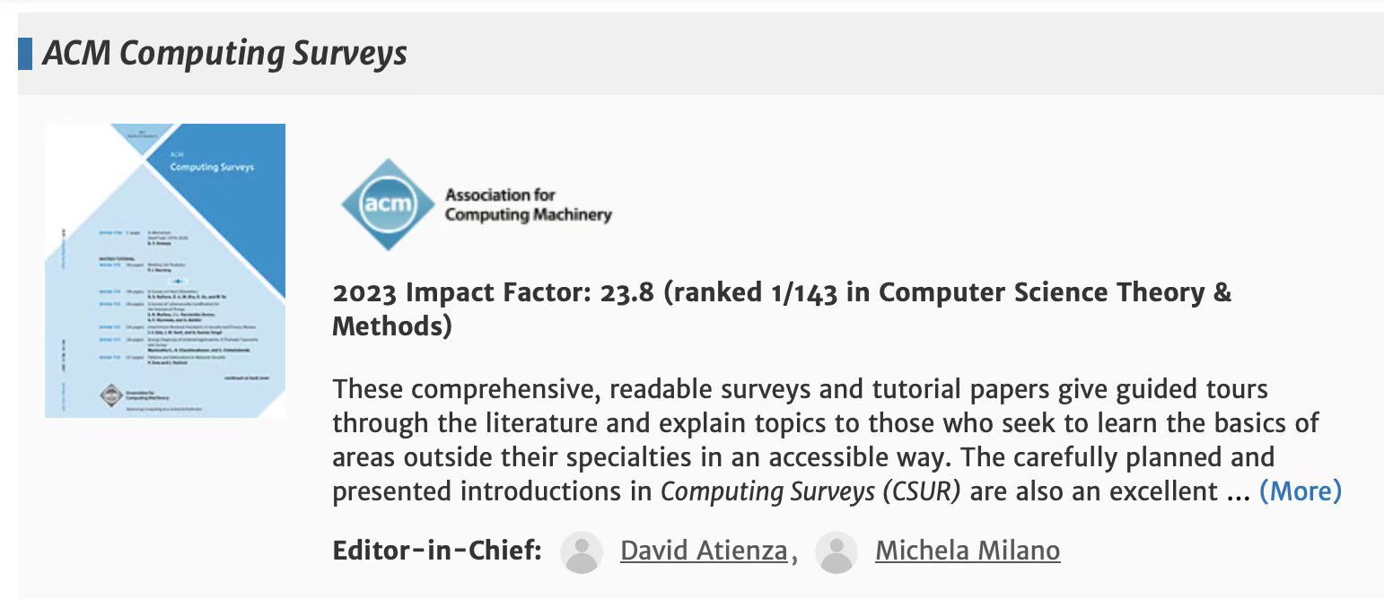 ACM Computing Surveys是美國計算機協會(ACM)旗下的期刊之一,是計算機科學、人工智能、軟件工程等領域的重要綜述類期刊,主要收錄計算機各分支領域的重要研究進展、技術綜述和文獻總結,致力于為科研人員和工程技術人員提供權威、系統、前沿的知識參考。該期刊的最新SCI影響因子為23.8(2023年數據,在Computer Science Theory & Methods領域排名第1/143),中科院一區TOP期刊,JCR分區Q1。